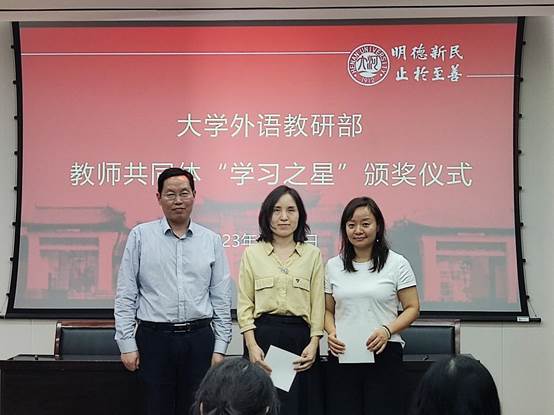 部党委副书记、副主任蒋框为教师共同体“学习之星”颁奖。他们分别是领读人姜晓娜、韩雯静、郑玮、薛丽娜、郭云仙,成员王玲、张聪沛、安琪、薛丽娜、于建凯、李冬青、曲捷、郑玮。