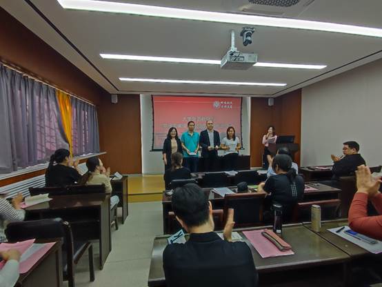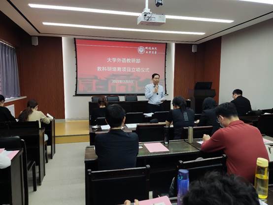 部党委书记、主任杨剑波为科研团队以及教科研培育项目立项教师颁发经费卡。科研团队分别为郭云仙“积极心理学与外语教学界面研究”团队,刘亚杰“翻译与跨文化研究”团队。教科研培育项目立项教师分别是郭云仙“中澳新历史小说历史观比较研究”、李冬青“ChatGPT类大语言模型赋能大学外语教学路径研究”、李恩光“情境植入视角下汉英肯定祈使句的认知对比研究”、曲捷“新学科背景下大学英语教师身份认同研究”、郑玮“‘双一流’高校学生外语学习愉悦情绪调控研究——积极心理学视角”。