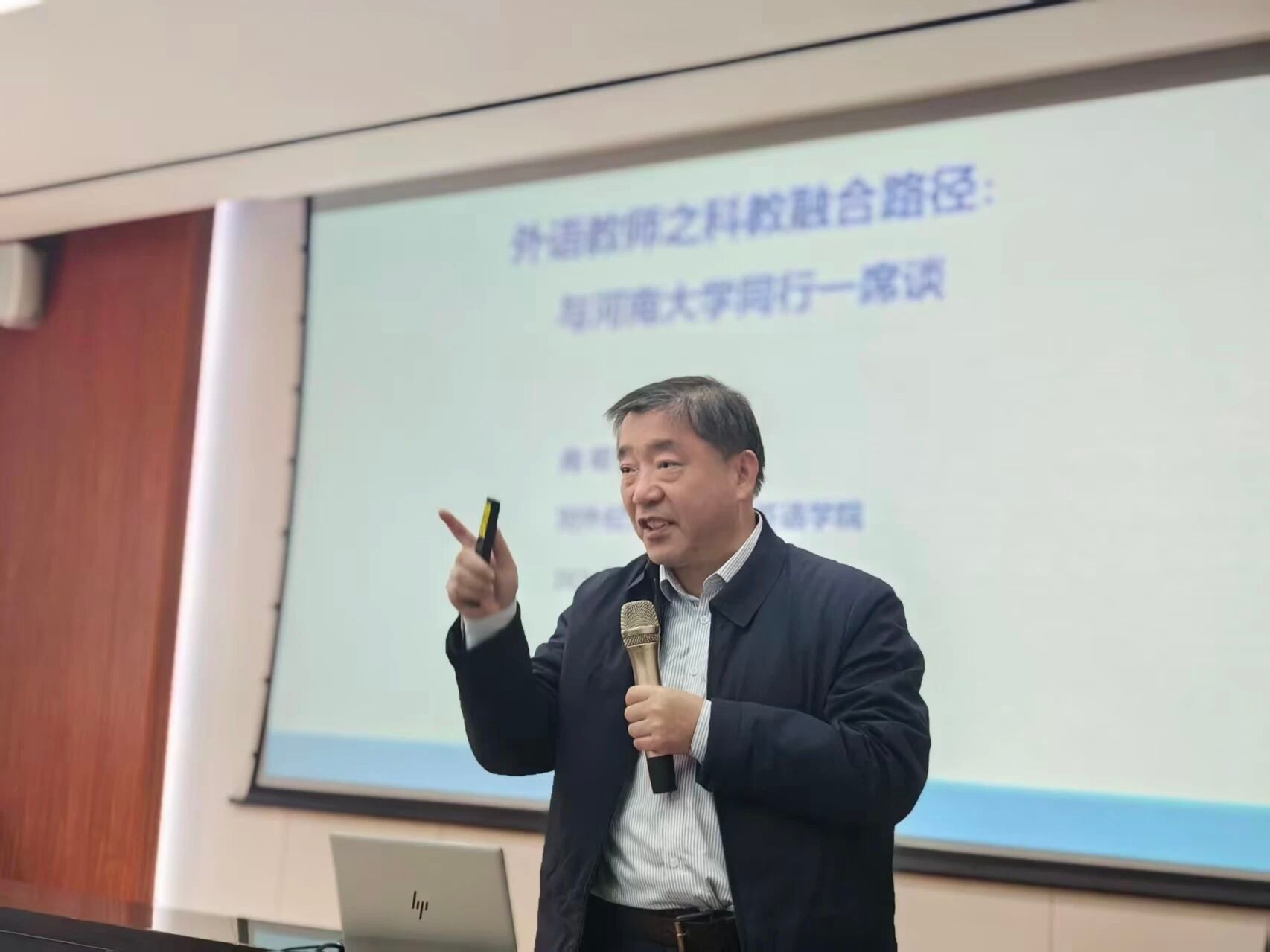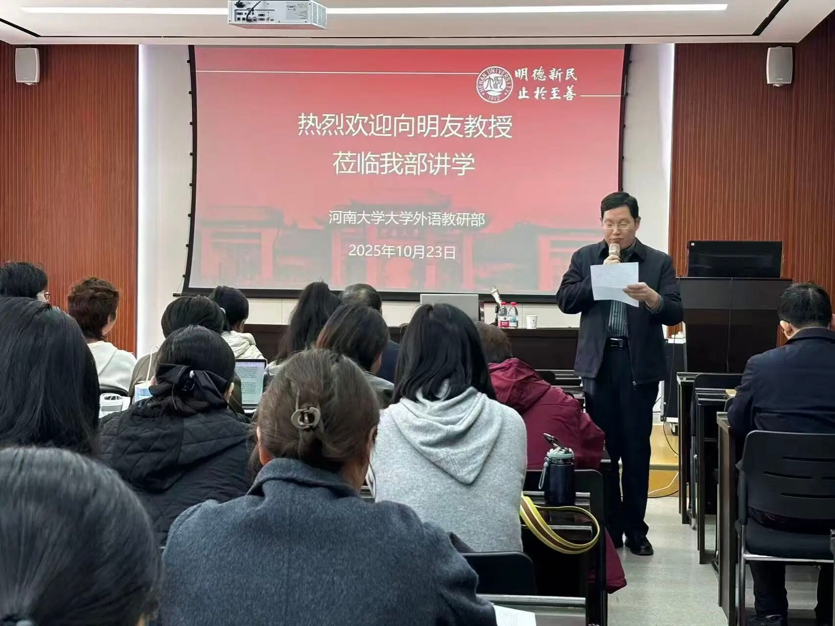 2025年10月23日,对外经济贸易大学向明友教授应黄瓜视频 之邀,做客“大学英语名家讲坛”,做了题为“外语教师之科教融合路径”的学术讲座。讲座在黄瓜视频 一楼大会议室举行,由部党委书记、主任杨剑波主持。