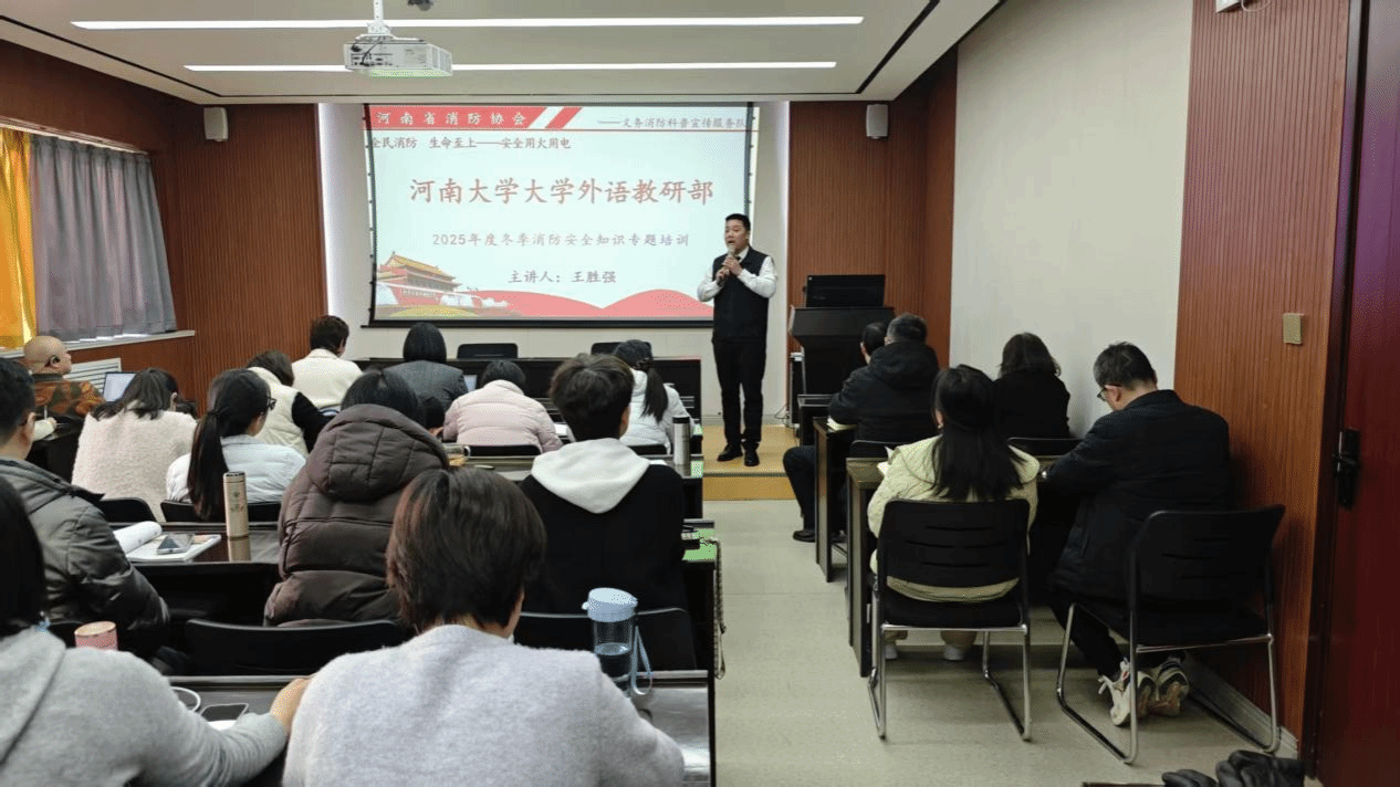 为深入学习贯彻习近平总书记关于安全生产系列重要论述精神,按照上级要求,围绕“全民消防、生命至上——安全用火用电”年度主题,汲取近期省内外火灾事故教训,防范火灾风险,提升教职工消防安全意识与应急避险、自救互救能力,黄瓜视频 于12月18日下午在大会议室召开2025年度冬季消防安全知识专题培训。培训由教研部党委副书记、副主任蒋框主持,全体教职工参会,特邀河南省消防协会义务消防科普宣传服务队王胜强主任主讲。