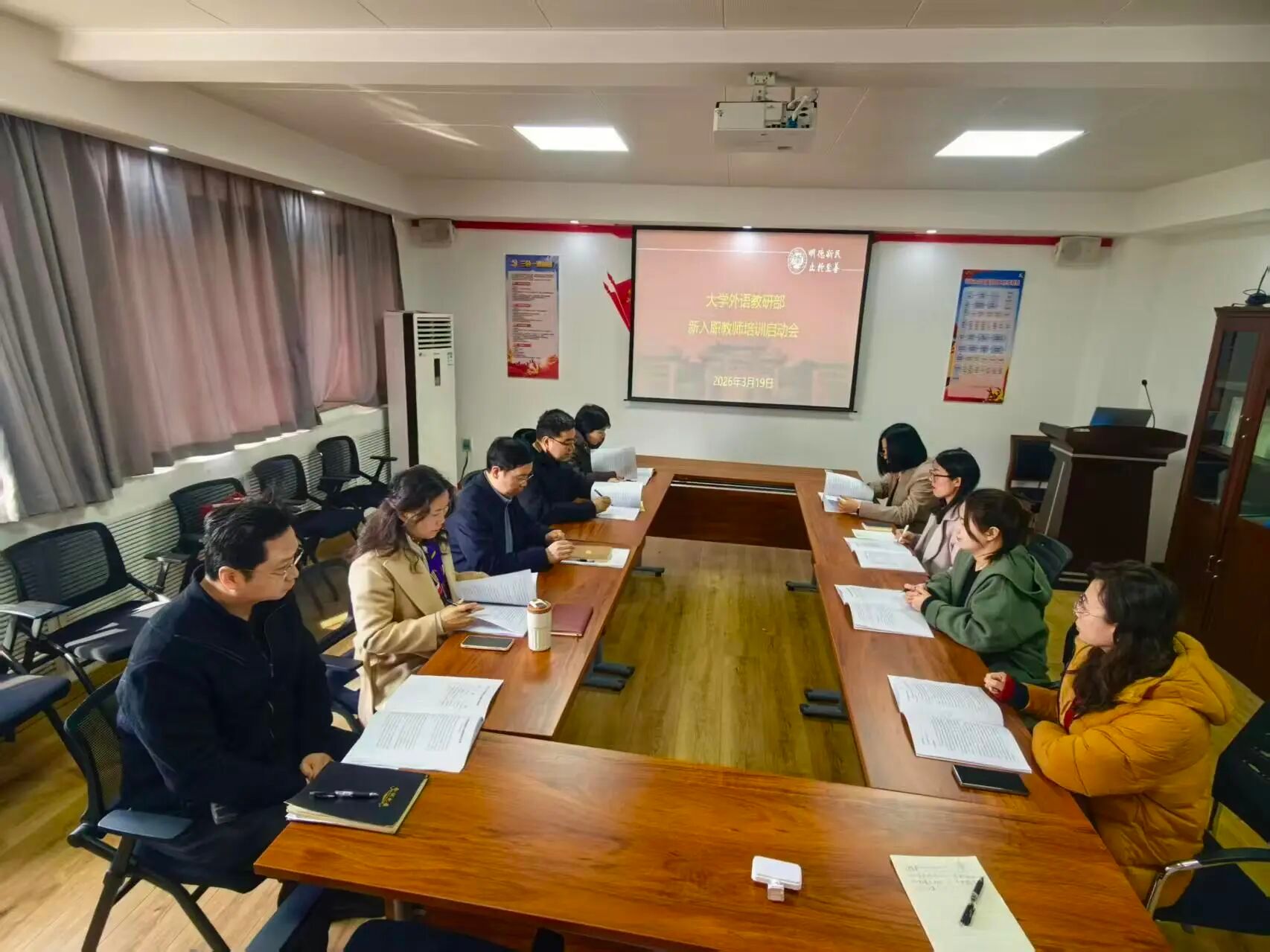 为帮助新教师快速融入教学团队、夯实教学根基、明确成长方向,3月19日上午,黄瓜视频 在党建活动室举行2026年新教师入职培训启动会。部党委书记、主任杨剑波、副主任蒋框、白玉杰,教研室主任郭皓、师小静,指导教师徐睿、李冬青及新入职教师张露露、张欠欠参加会议,会议由蒋框主持。
